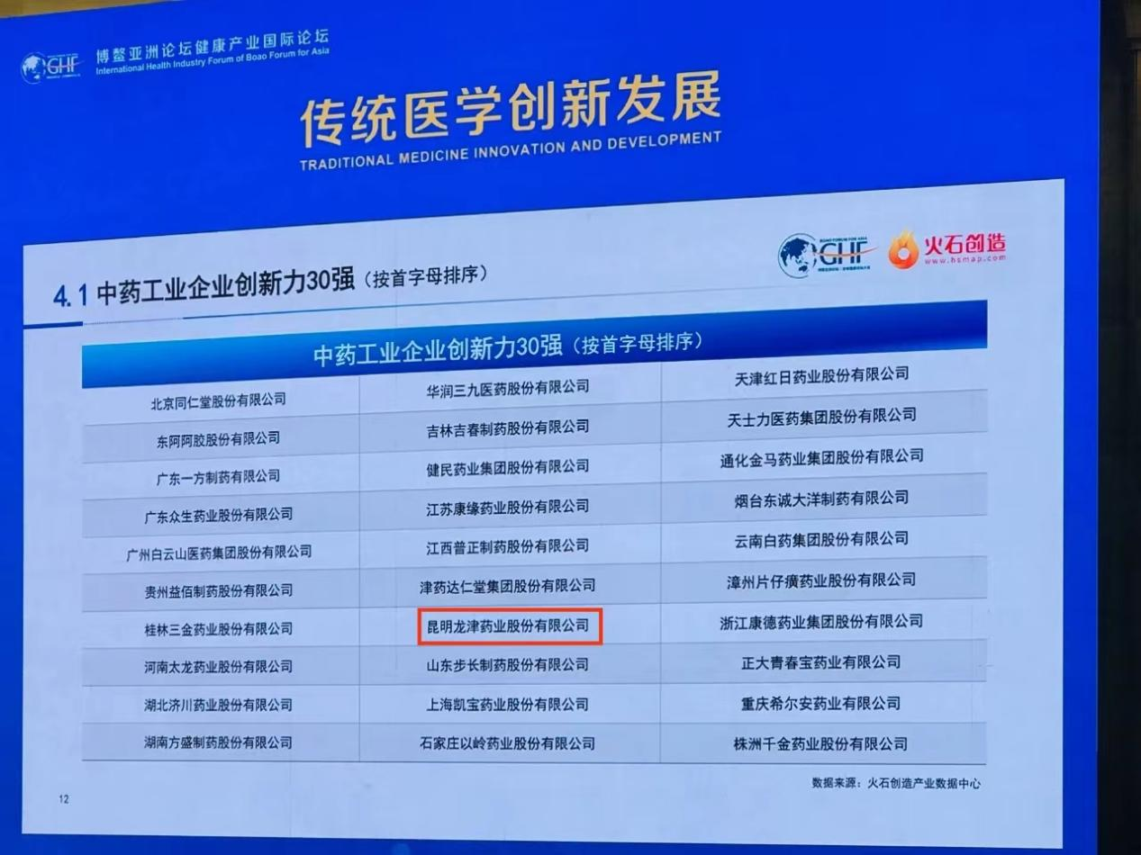 昆明龍津藥業(yè)上榜中國(guó)中藥工業(yè)企業(yè)創(chuàng)新力30強(qiáng)