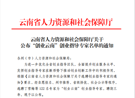 2023年11月7日,云南省人力資源和社會(huì)保障廳公布了本次選聘的122名“創(chuàng)業(yè)云南”創(chuàng)業(yè)指導(dǎo)專(zhuān)家,我司總經(jīng)理樊麗娟女士被聘為投資融資類(lèi)創(chuàng)業(yè)指導(dǎo)專(zhuān)家,聘期三年。