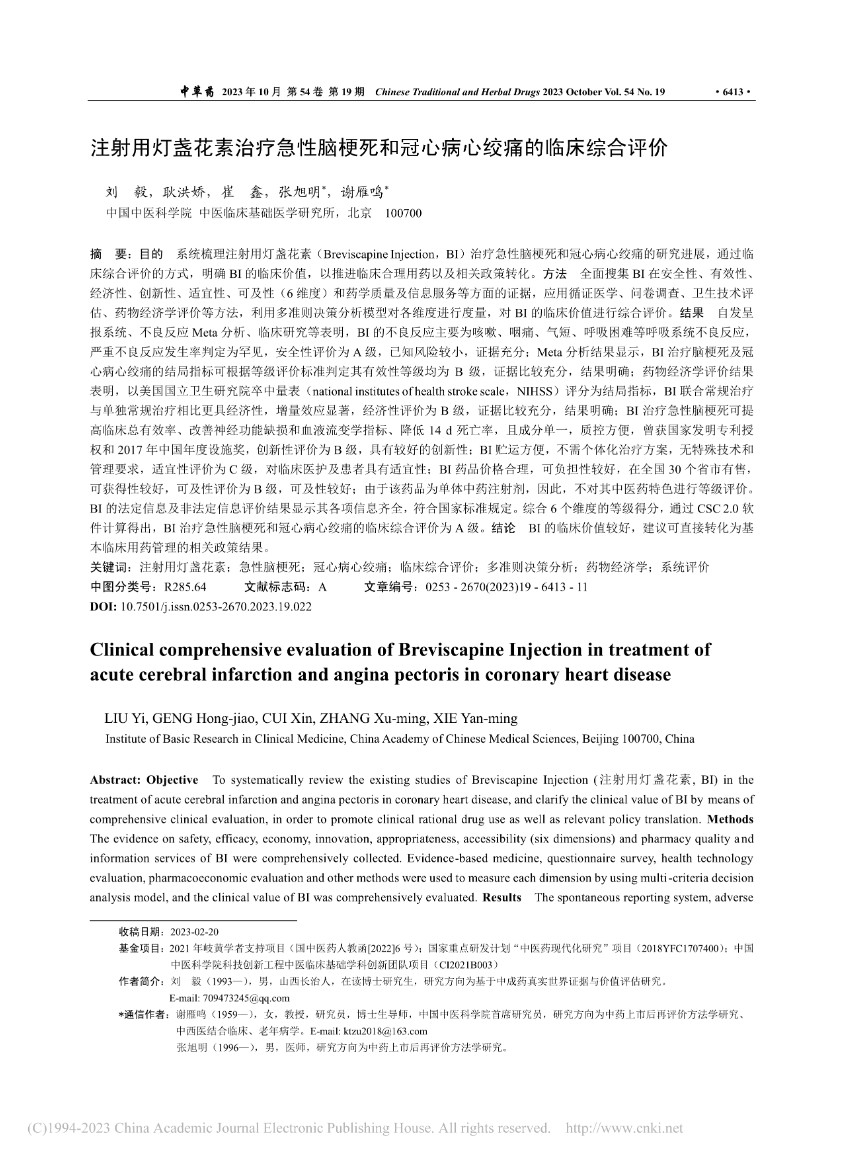 題目:注射用燈盞花素治療急性腦梗死和冠心病心絞痛的臨床綜合評價